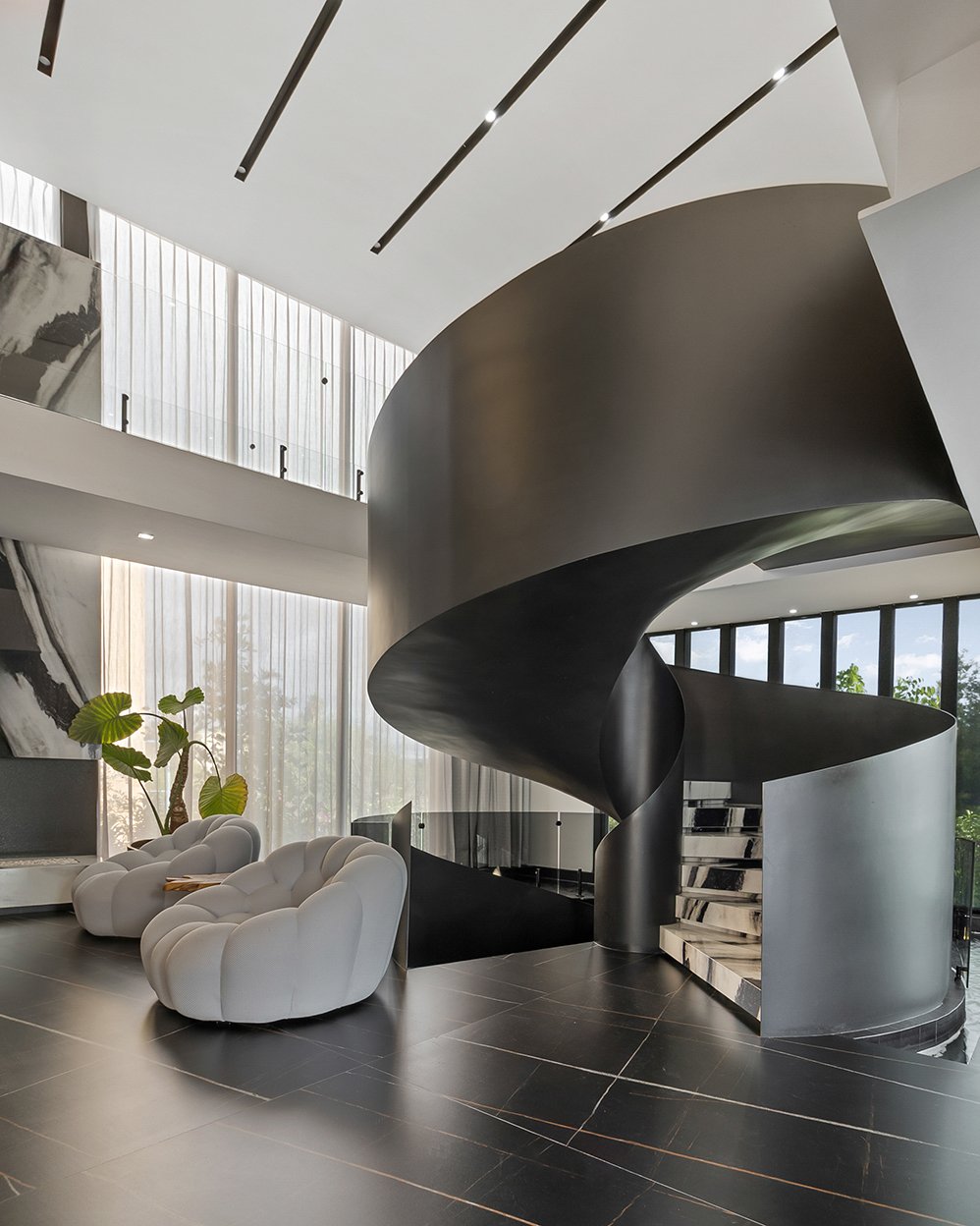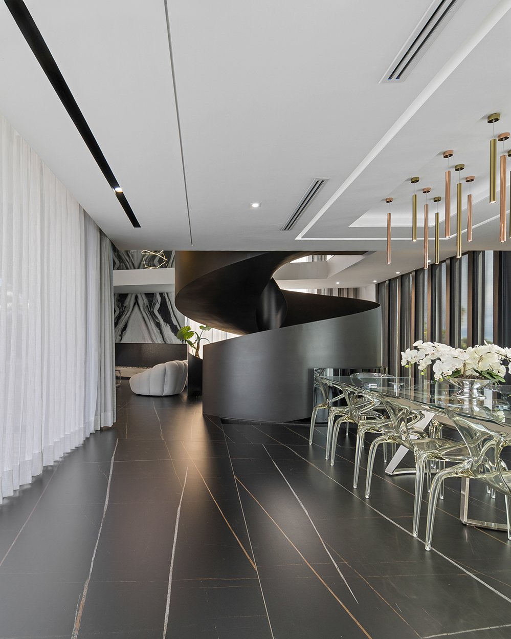 La escalera principal, con su trazo curvo y escultórico, se convierte en un punto focal dentro del espacio. Más que un elemento de circulación, es una pieza artística que aporta movimiento y carácter al conjunto. Cada línea, cada textura, parece formar parte de una gran escultura habitable, donde lo funcional se vuelve estético. El mobiliario y los acabados refuerzan esta visión, generando una atmósfera sofisticada y coherente.
