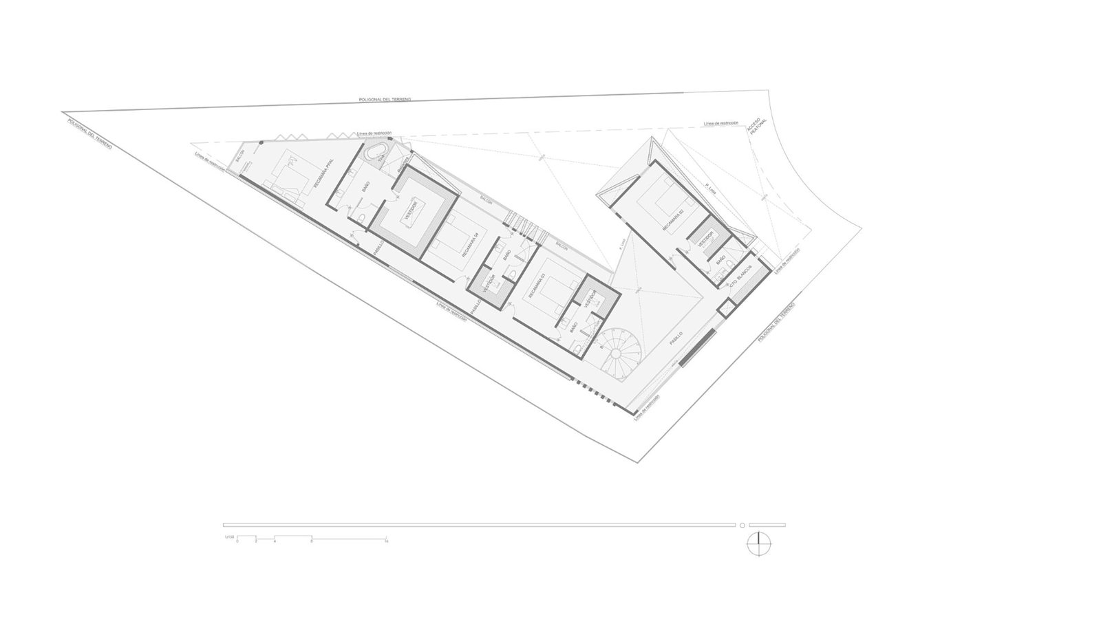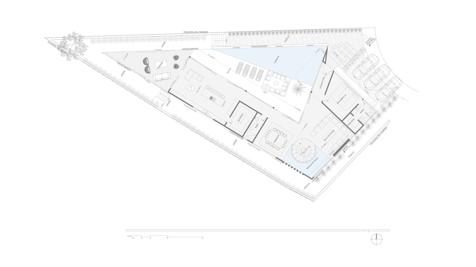 Capuchinas Villa se erige como un proyecto residencial que busca el balance entre la pureza geométrica de la arquitectura contemporánea y la integración armónica con la naturaleza. Desde la fachada principal, la vivienda manifiesta un lenguaje de gran limpieza formal, donde los volúmenes se articulan con sobriedad y elegancia. Las líneas rectas y los planos en ángulo generan una composición dinámica que, sin necesidad de ornamentos, transmite carácter y modernidad. La vegetación cuidadosamente colocada, como las palmeras y jardineras frontales, suaviza la contundencia de los volúmenes y establece un diálogo entre lo orgánico y lo arquitectónico.