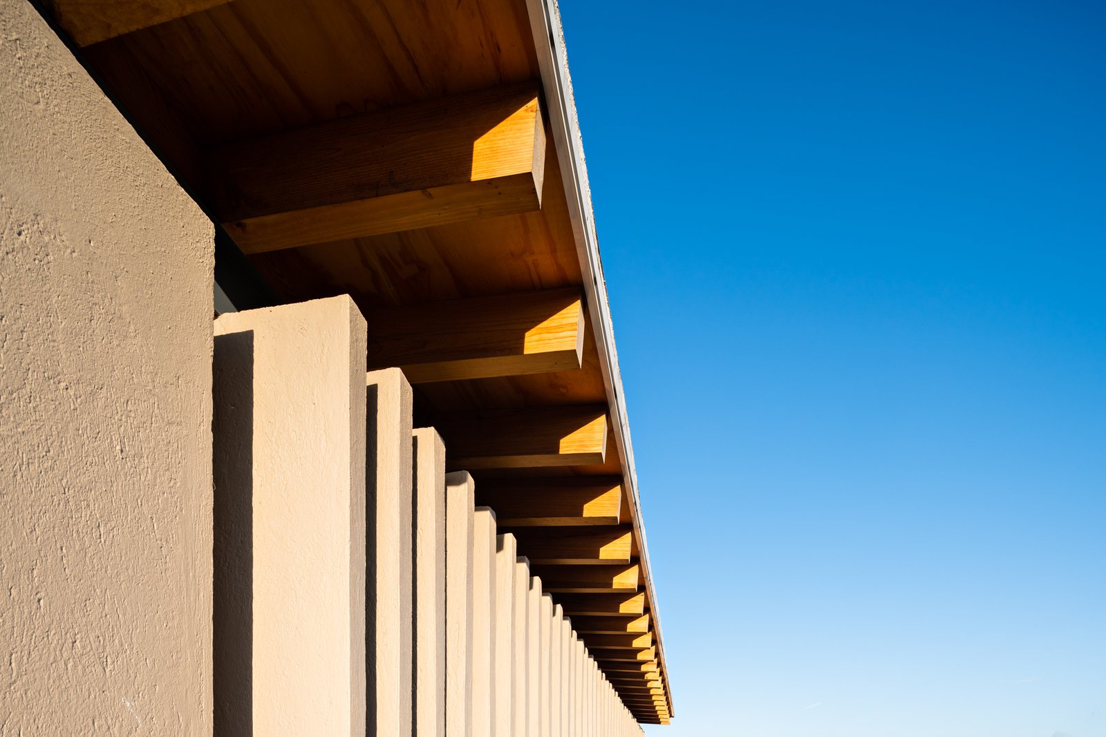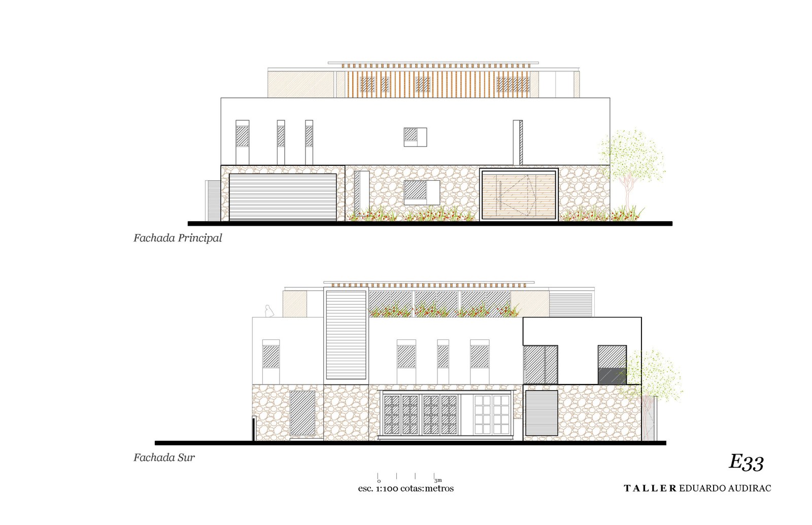Las fachadas se conciben a partir de planteamientos clásicos (base, fuste y capitel). Se genera un basamento pétreo con un marco de concreto aparente y una cálida puerta de madera tipo tzalam. El siguiente nivel presenta un acabado rústico en color blanco, mientras que el remate incluye colores cálidos y cartelas con viguerías de madera.