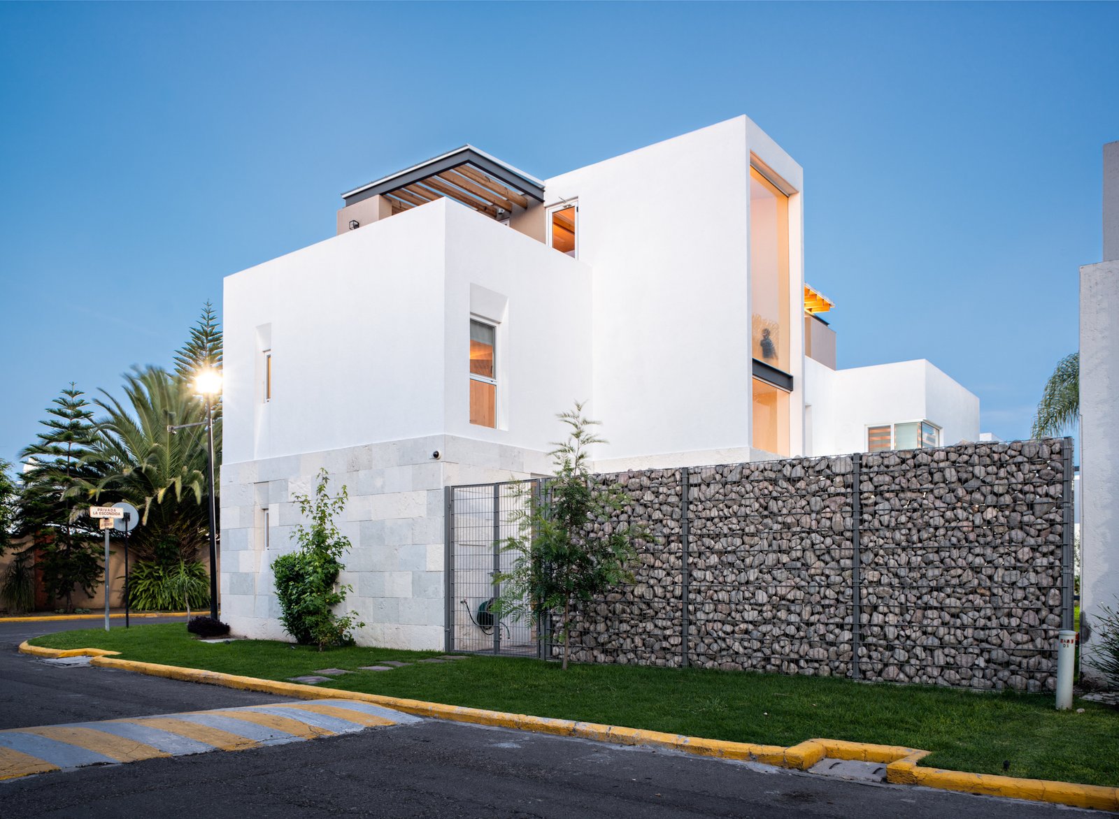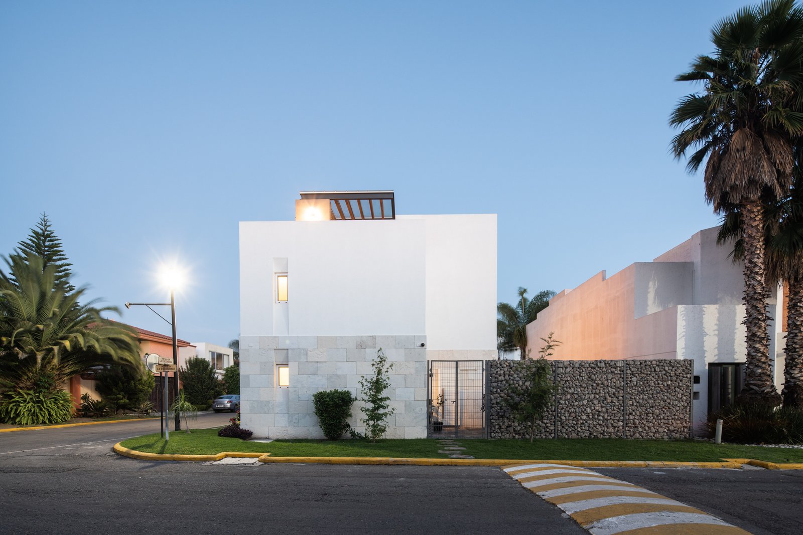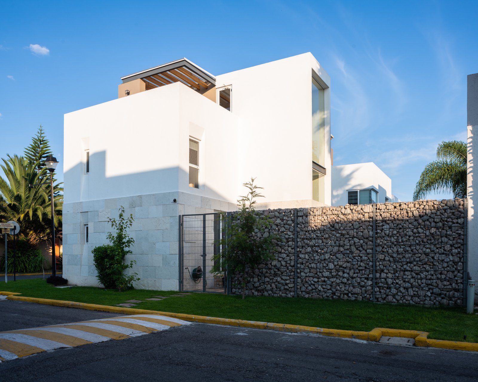 El esquema consiste en un único volumen que agrupa todo el programa y parece flotar sobre el predio de 400 m2. Este volumen se libera de la colindancia sur para generar un jardín que inunda de verde y calor las habitaciones en todos los niveles, integrándose de manera discreta, callada pero empática a la escala peatonal. Además, respeta las restricciones del condominio y genera espacios verdes que benefician al vecindario.