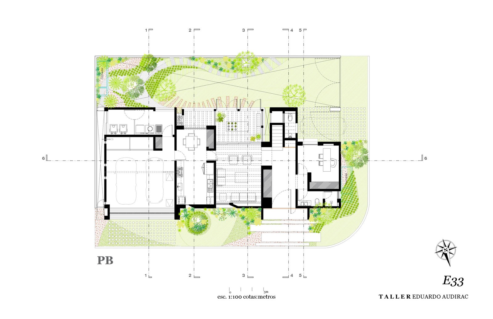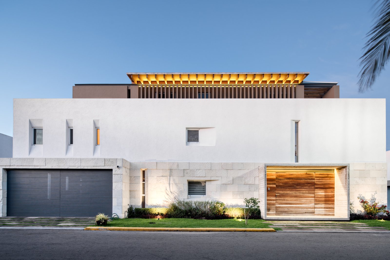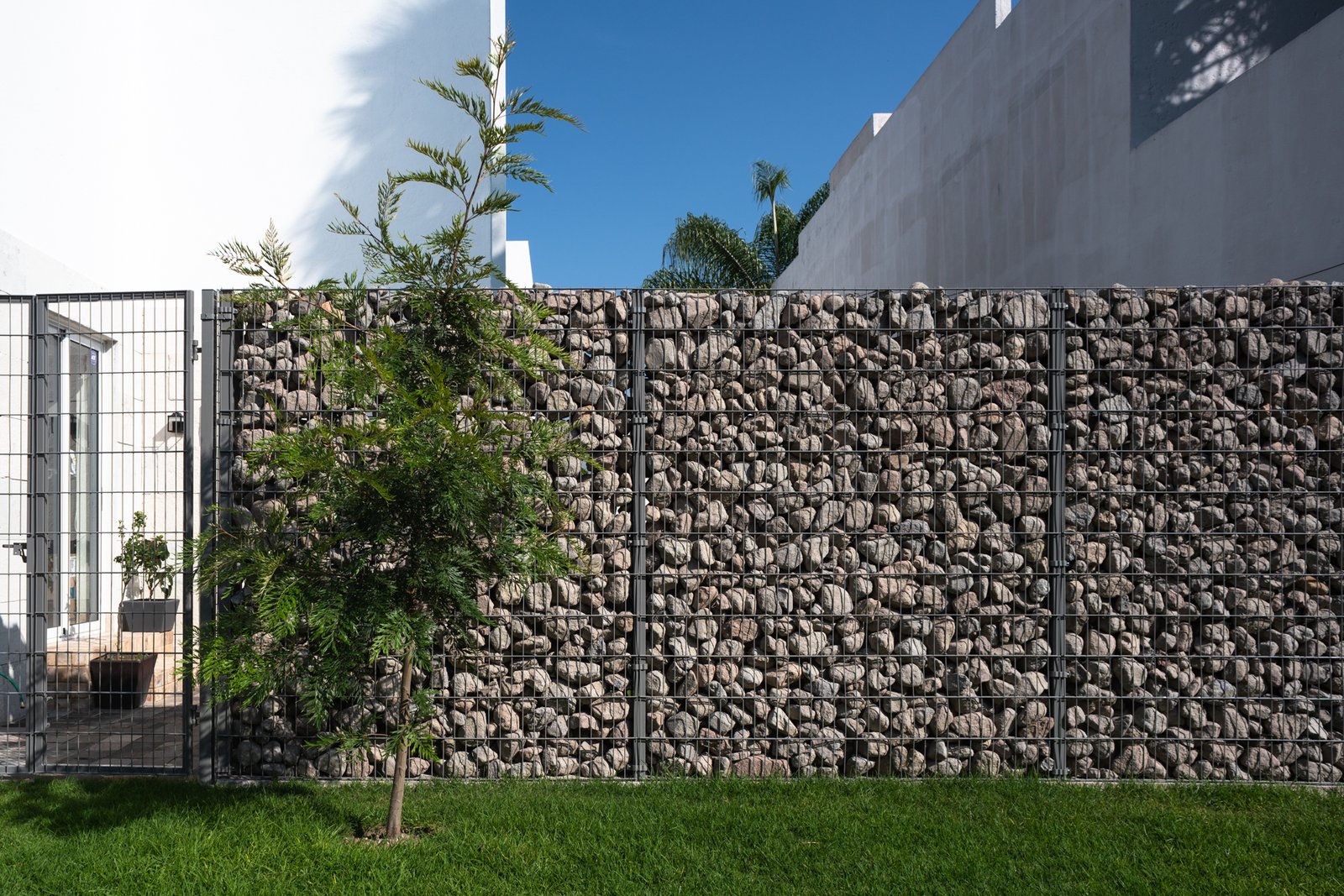 El esquema consiste en un único volumen que agrupa todo el programa y parece flotar sobre el predio de 400 m2. Este volumen se libera de la colindancia sur para generar un jardín que inunda de verde y calor las habitaciones en todos los niveles, integrándose de manera discreta, callada pero empática a la escala peatonal. Además, respeta las restricciones del condominio y genera espacios verdes que benefician al vecindario.