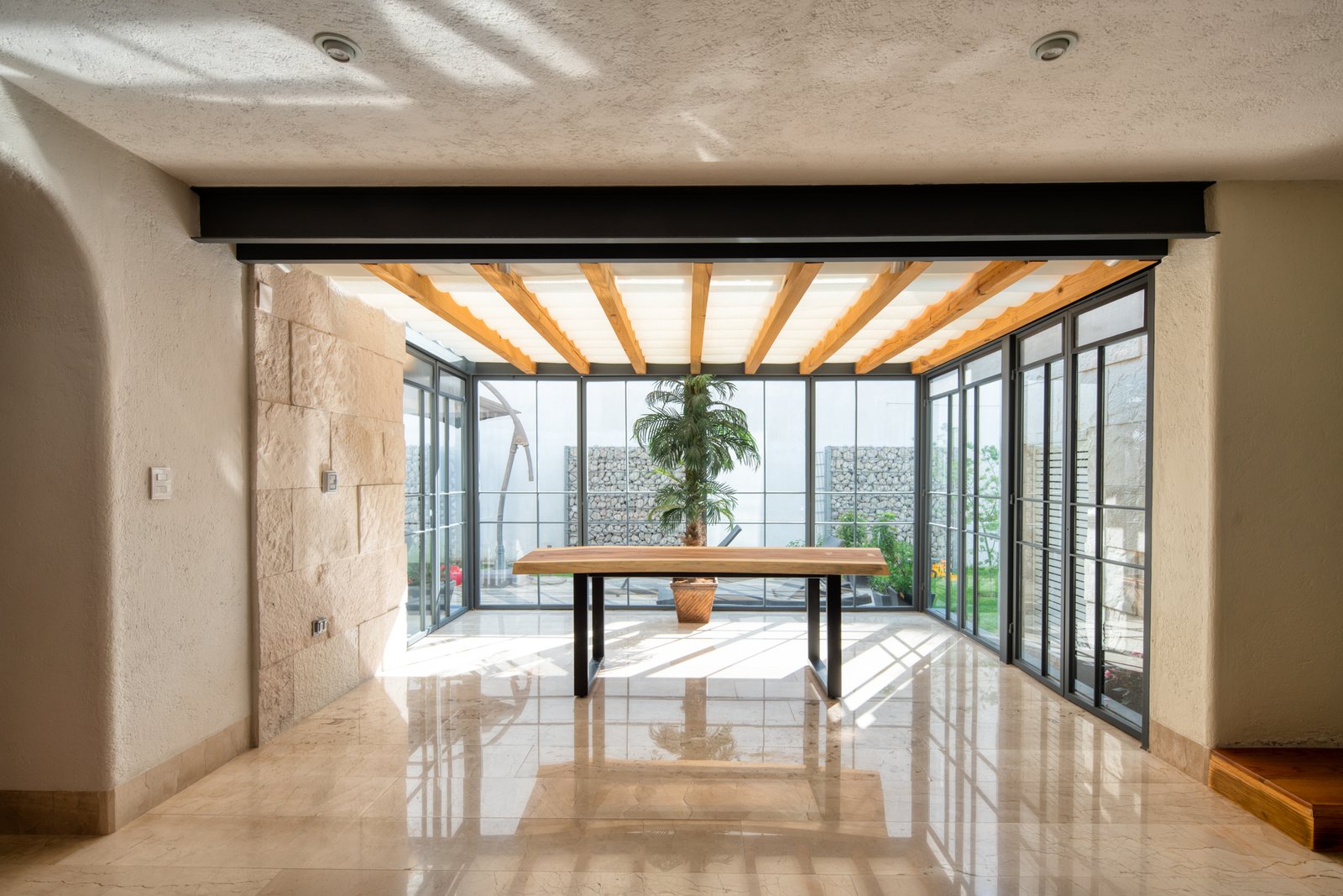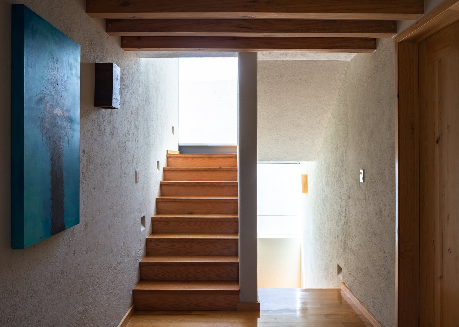 La secuencia espacial se organiza en forma de cruz que atraviesa esta ‘caja de zapatos’. En la planta baja se resuelve todo el programa público y de servicio; en el primer nivel se ubican los dormitorios, y en el último nivel se disponen una sala de TV y una terraza desde donde se aprecian los volcanes, así como un oratorio.