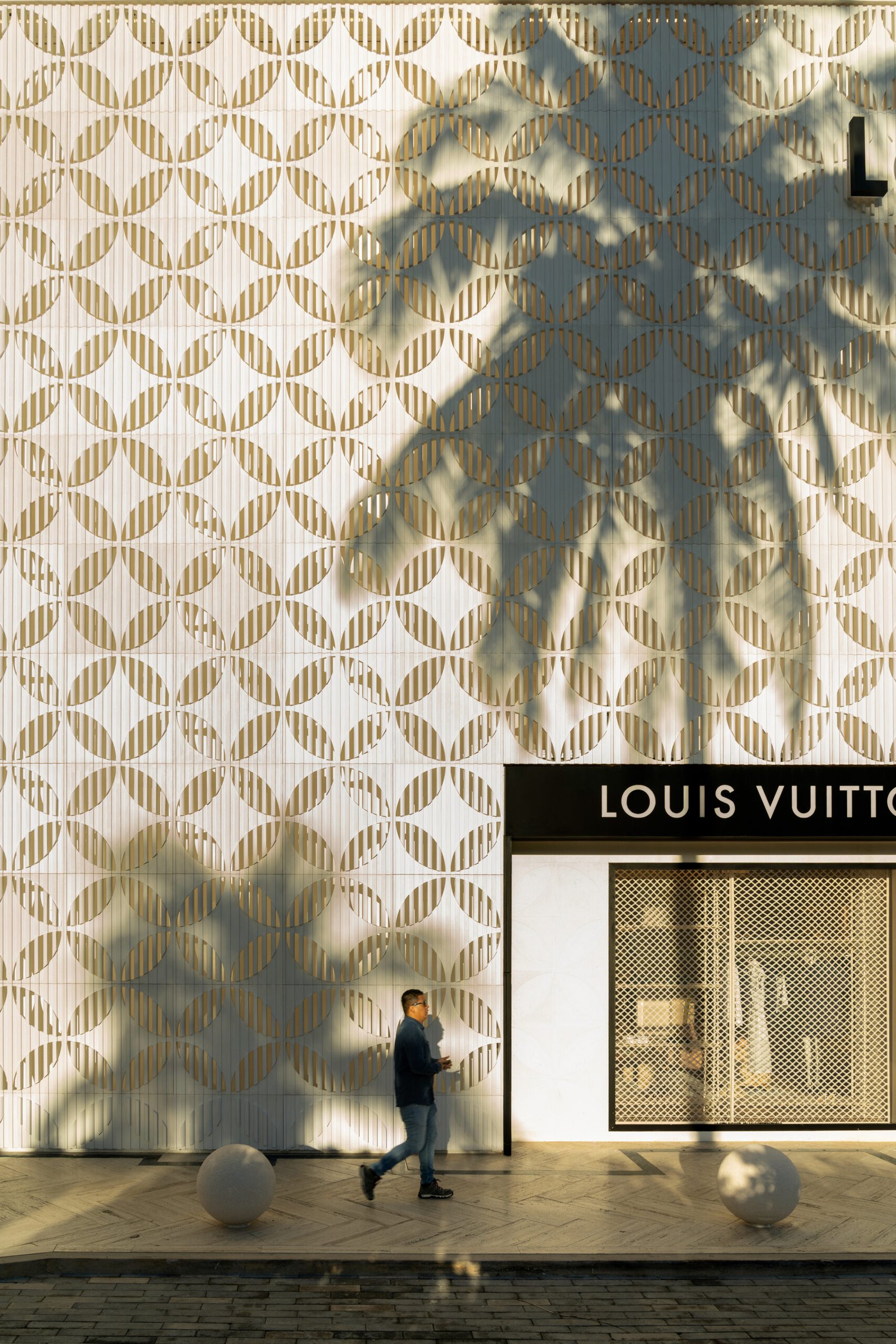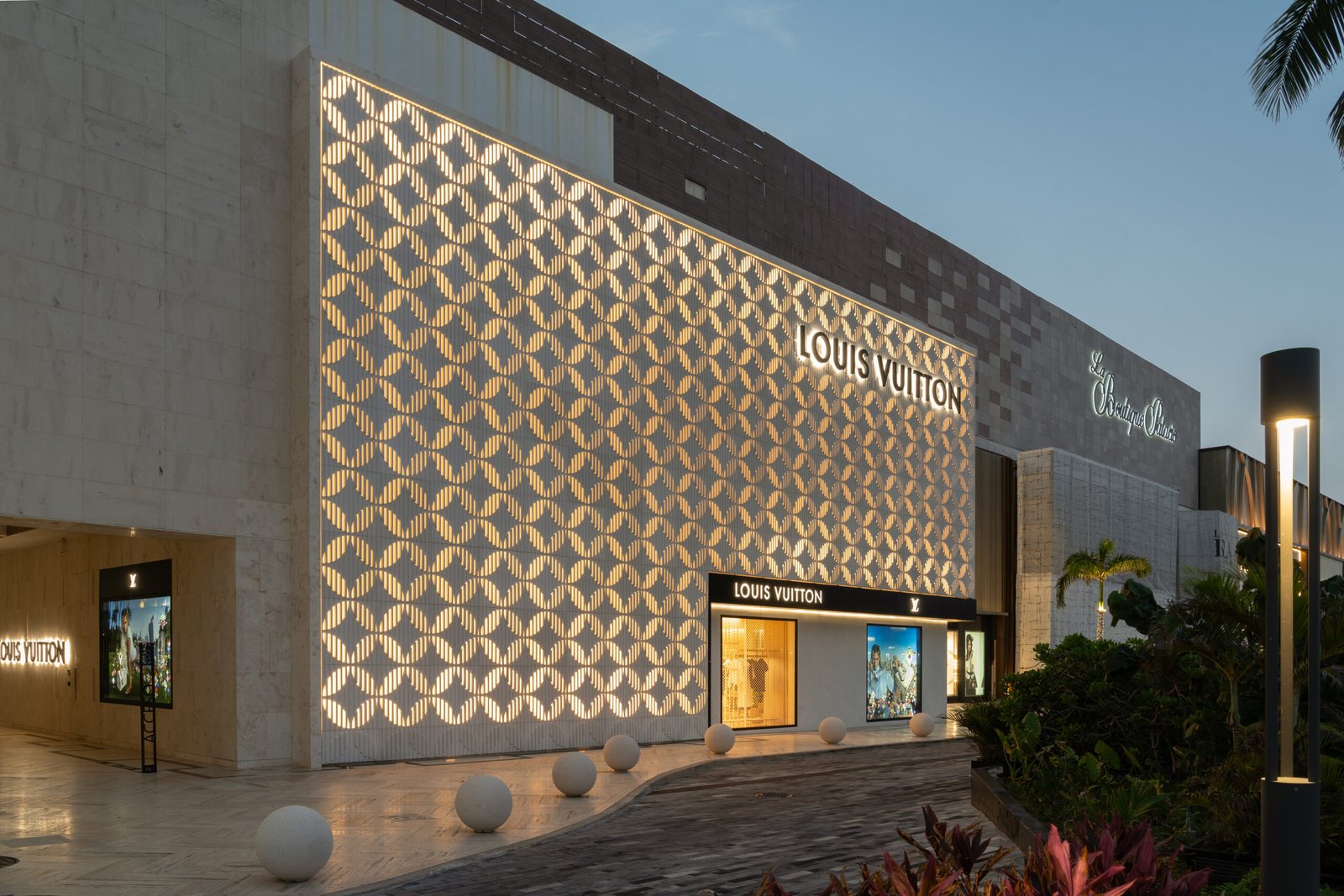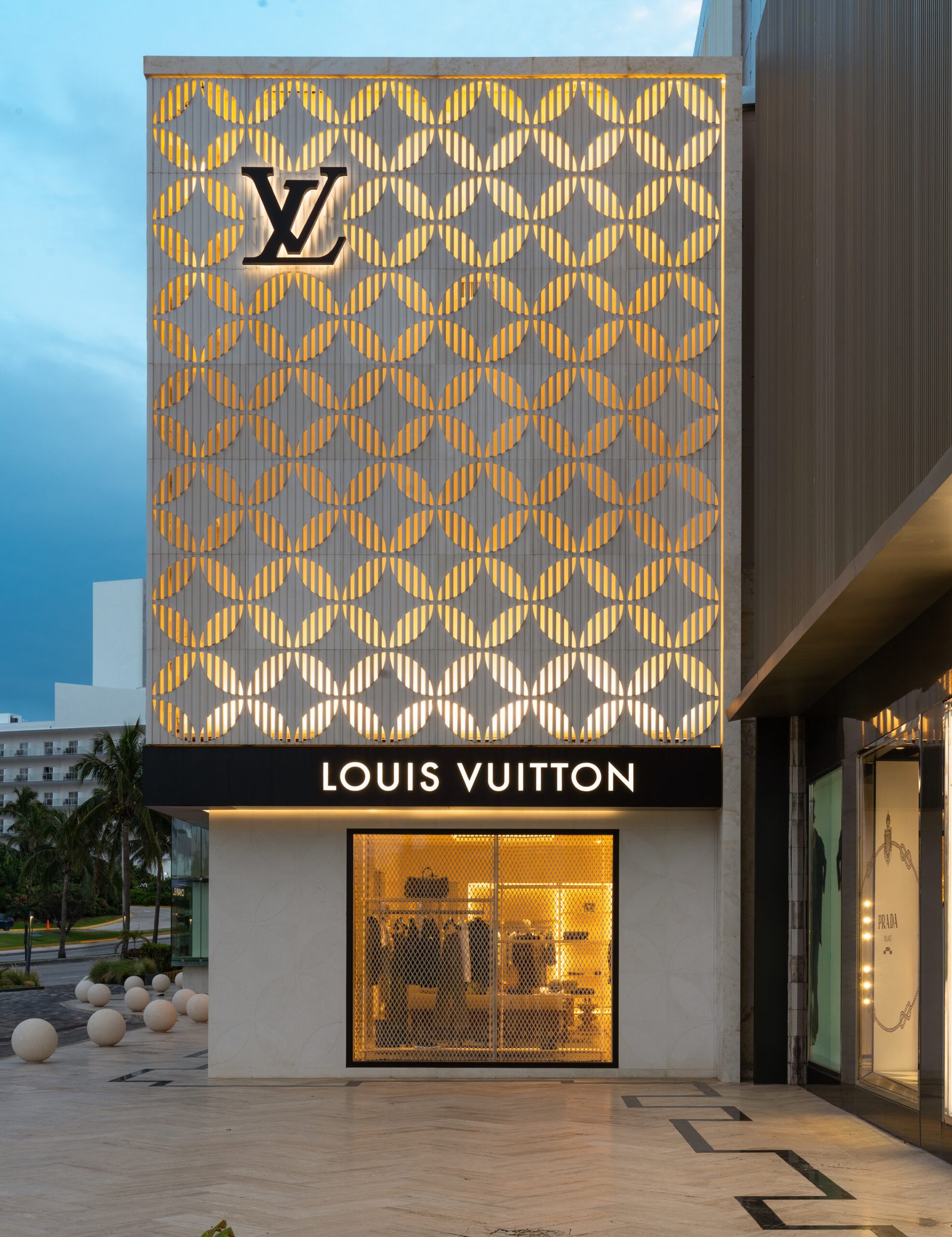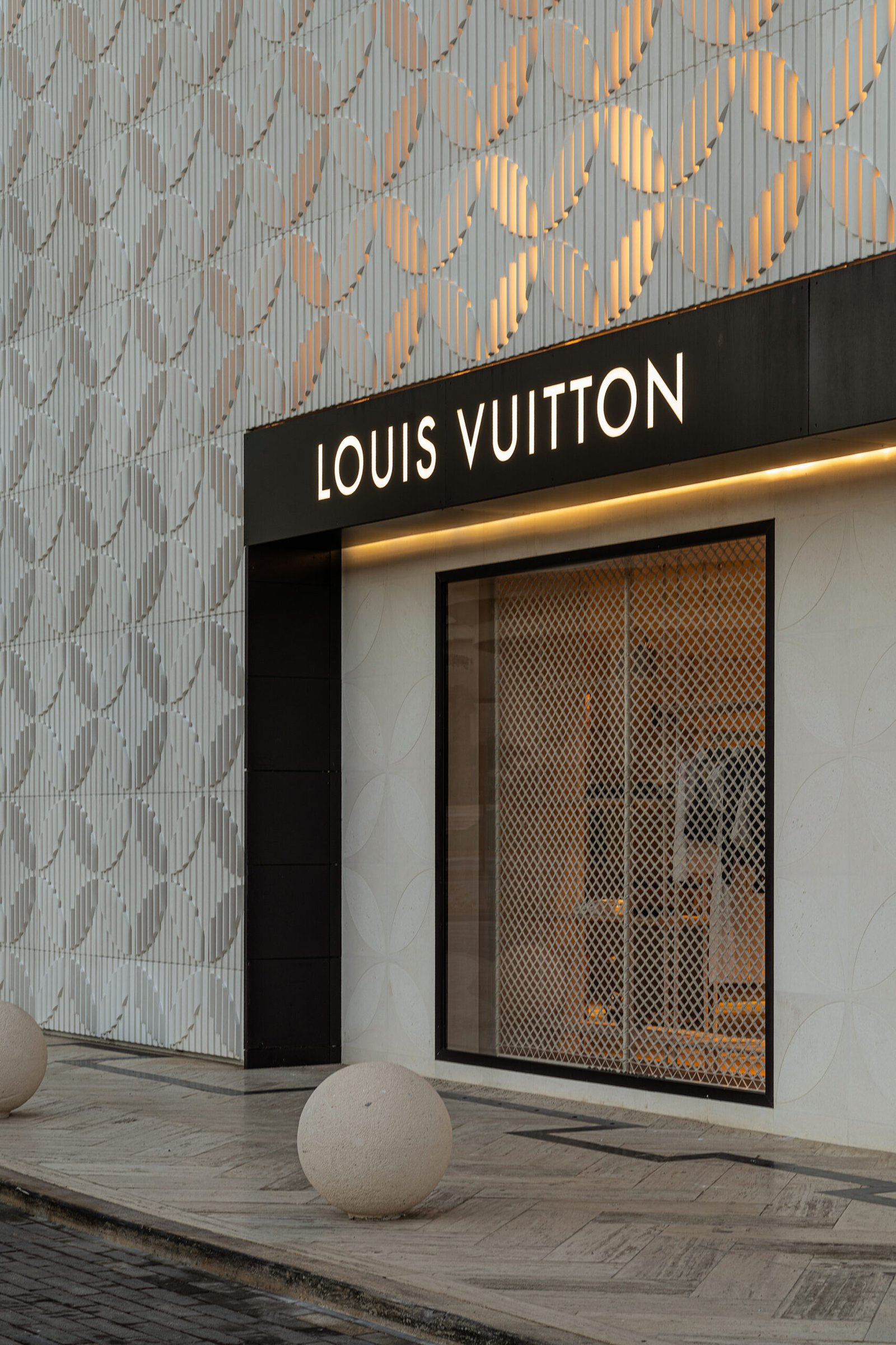 A doce años de su primera colaboración con Louis Vuitton en Cancún, Materia presenta una nueva intervención que reinterpreta la fachada de la boutique como una superficie viva y sensorial. Este proyecto parte de la exploración previa con paneles de madera, llevada ahora al límite con concreto prefabricado, cuya plasticidad permitió reinterpretar la icónica flor de Louis Vuitton como un relieve que se despliega en una coreografía de luz y sombra. El diseño se articula mediante un módulo que, al ensamblarse, genera una superficie continua y vibrante. Cada pieza, concebida con precisión, actúa como elemento constructivo, captando la luz y generando identidad. En su conjunto, estas piezas trascienden su condición individual para formar un sistema que refleja tanto la memoria del diseño original como la capacidad del concreto de dar forma a la emoción y al detalle. Esta fachada reafirma el compromiso de Materia con la comprensión profunda de los materiales y su potencial expresivo, consolidando una arquitectura que se experimenta y se siente.