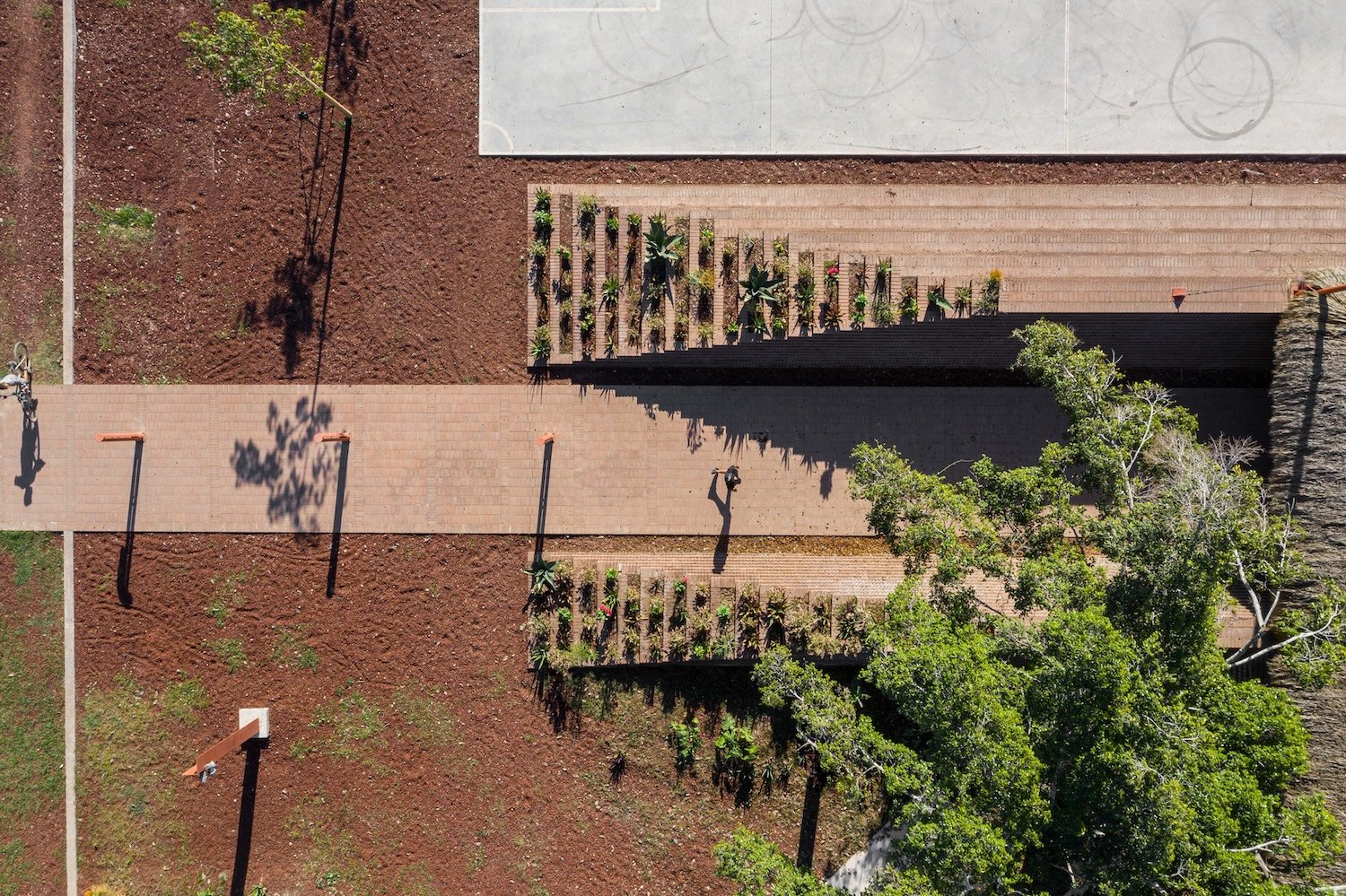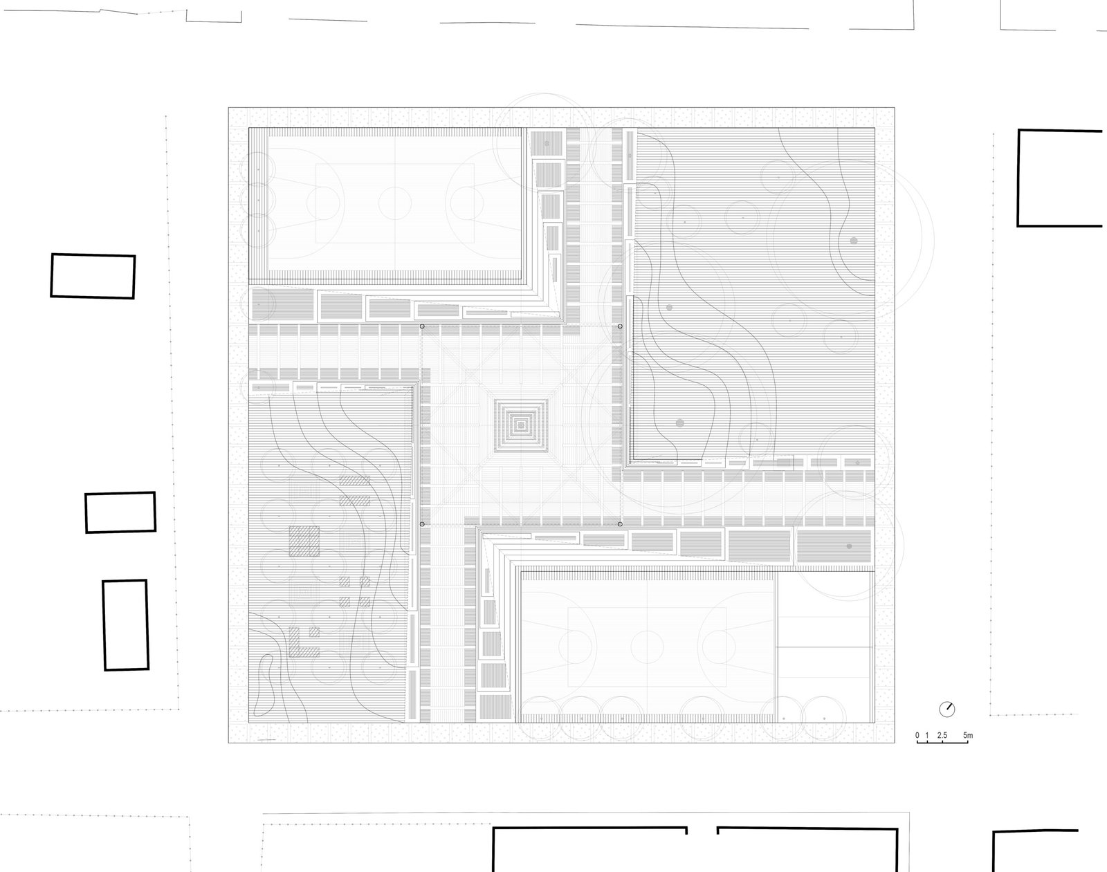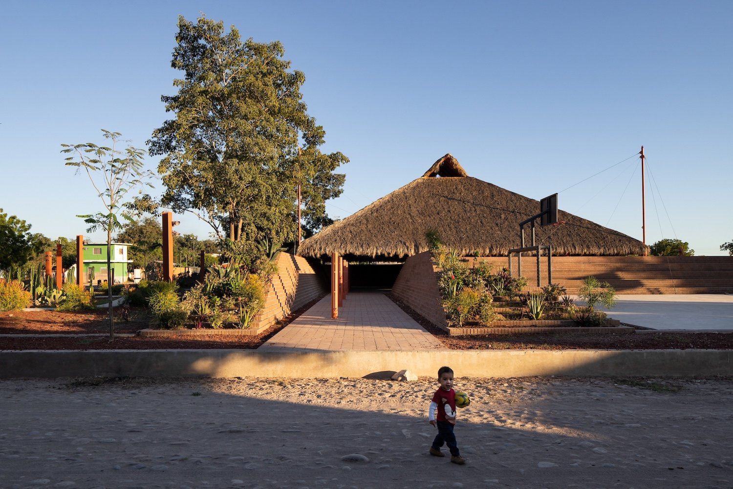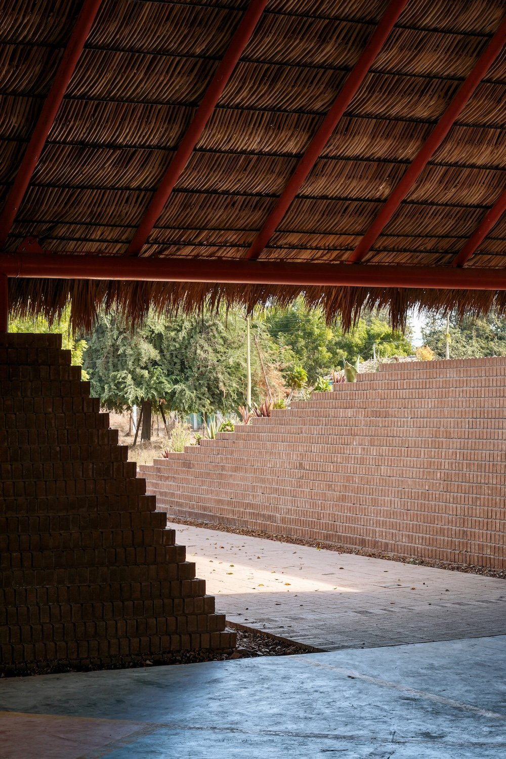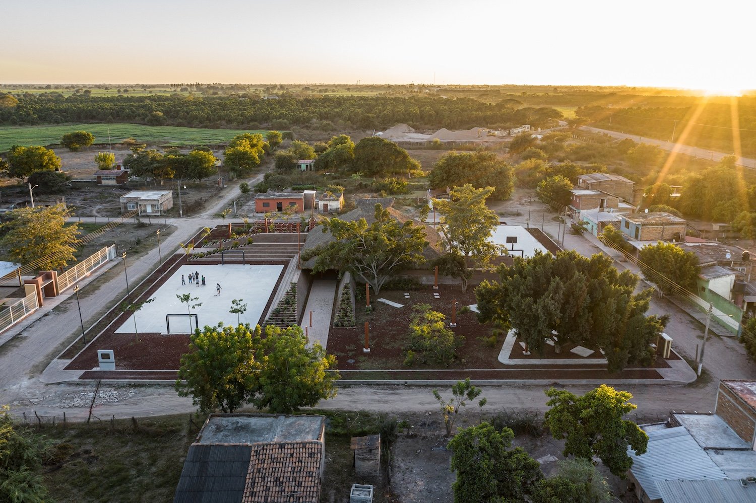 La comisión es una nueva plaza que debe integrarse con la iglesia. El objetivo del proyecto es articular el espacio abierto y la iglesia, reconociendo los diversos bordes que conforman el sitio (borde del poblado, andadores peatonales y vehiculares y la carretera) y conservando la vegetación existente. A través de un gesto diagonal, se hacen coincidir los ejes de ambos espacios y se crea la articulación entre ellos: Una pequeña plaza que formaliza el pavimento a los pies del acceso de la iglesia y que forma la primera de las múltiples plataformas que se elevan en la plaza para crear una topografía habitable. En el perímetro la topografía crea, naturalmente, un talud que define el espacio de los dos andadores perimetrales a la plaza. De este modo la iglesia se integra, en l amedida de lo posible a las dinámicas del poblado, se relaciona con el paisaje y se protege de la carretera, visual y acústicamente, con el espacio público de un foro ascendente.