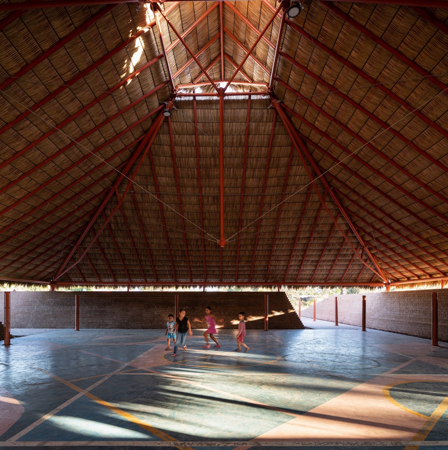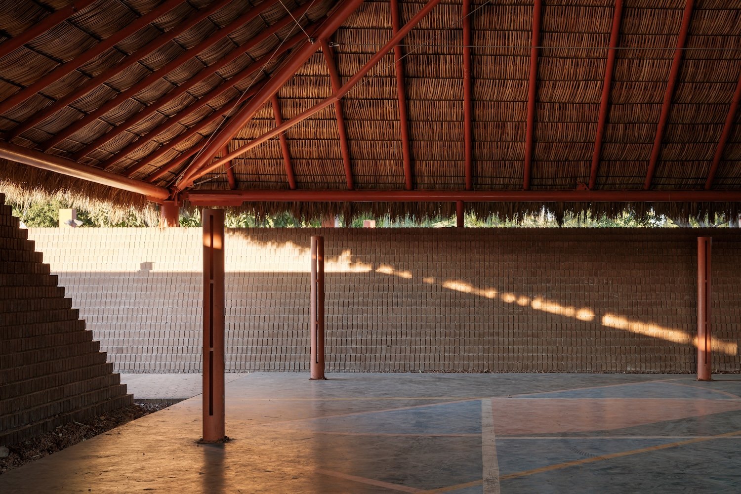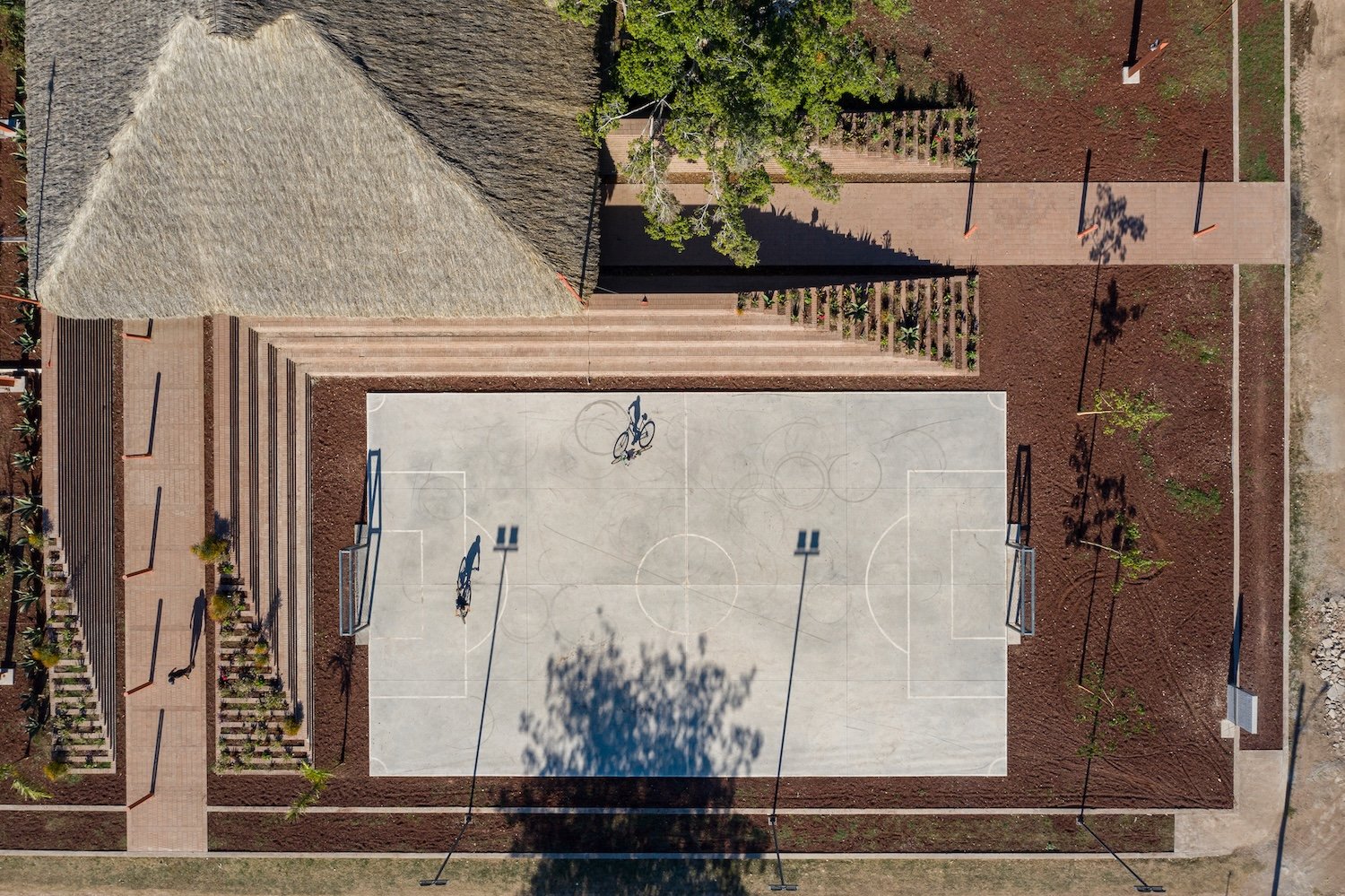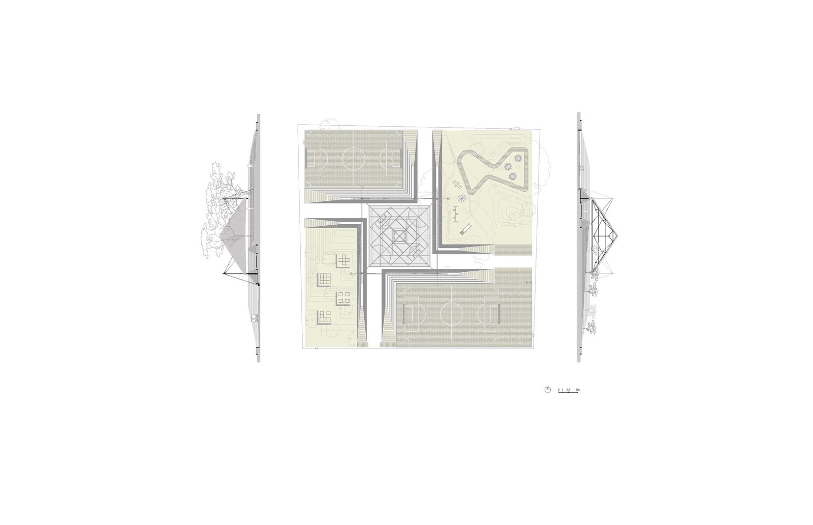 La comisión es una nueva plaza que debe integrarse con la iglesia. El objetivo del proyecto es articular el espacio abierto y la iglesia, reconociendo los diversos bordes que conforman el sitio (borde del poblado, andadores peatonales y vehiculares y la carretera) y conservando la vegetación existente. A través de un gesto diagonal, se hacen coincidir los ejes de ambos espacios y se crea la articulación entre ellos: Una pequeña plaza que formaliza el pavimento a los pies del acceso de la iglesia y que forma la primera de las múltiples plataformas que se elevan en la plaza para crear una topografía habitable. En el perímetro la topografía crea, naturalmente, un talud que define el espacio de los dos andadores perimetrales a la plaza. De este modo la iglesia se integra, en l amedida de lo posible a las dinámicas del poblado, se relaciona con el paisaje y se protege de la carretera, visual y acústicamente, con el espacio público de un foro ascendente.
